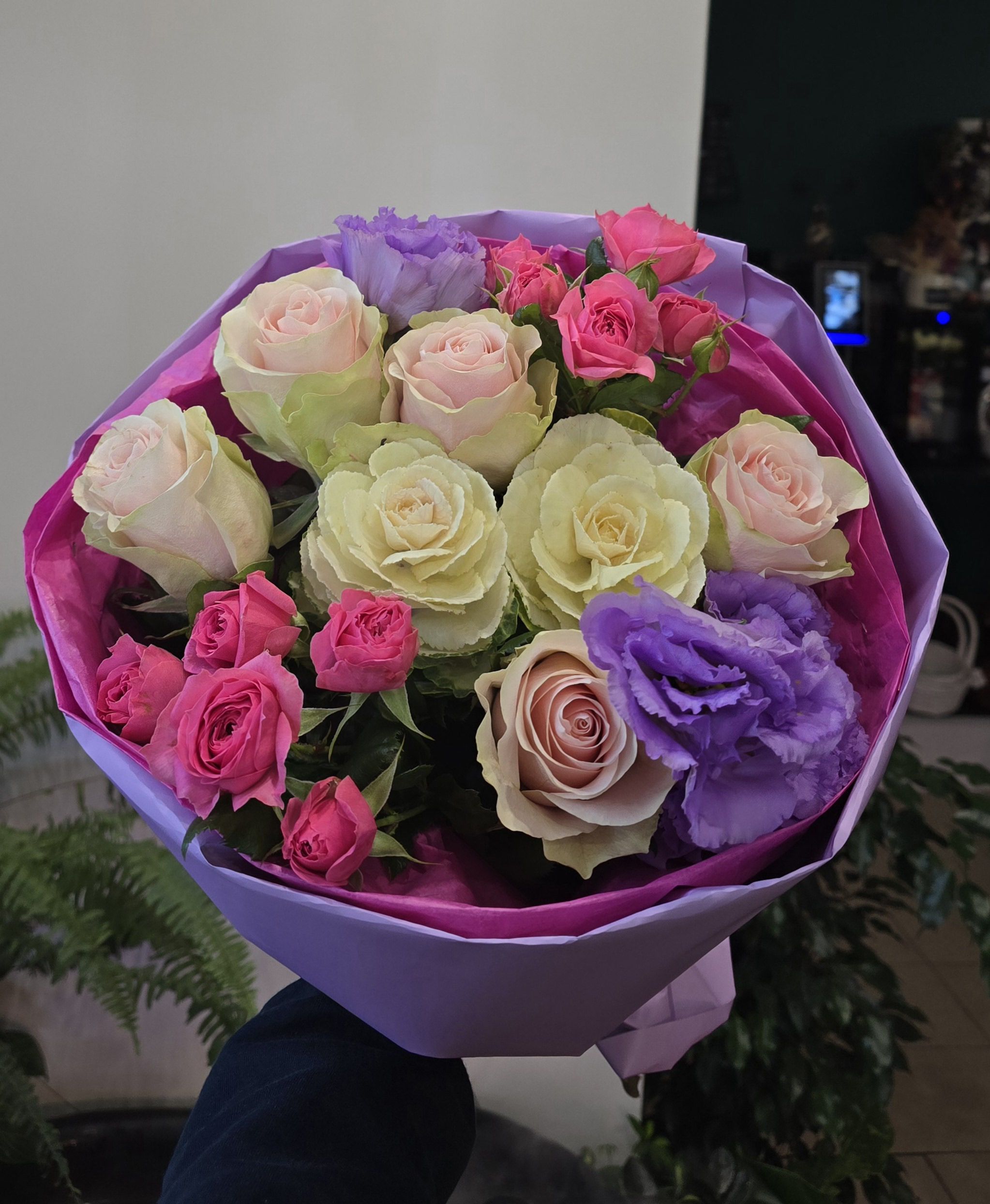 Роза Фрутетто - 5 шт, кустовая роза - 2 шт, лизиантус российский - 2 шт, брассика - 2 шт, упаковка