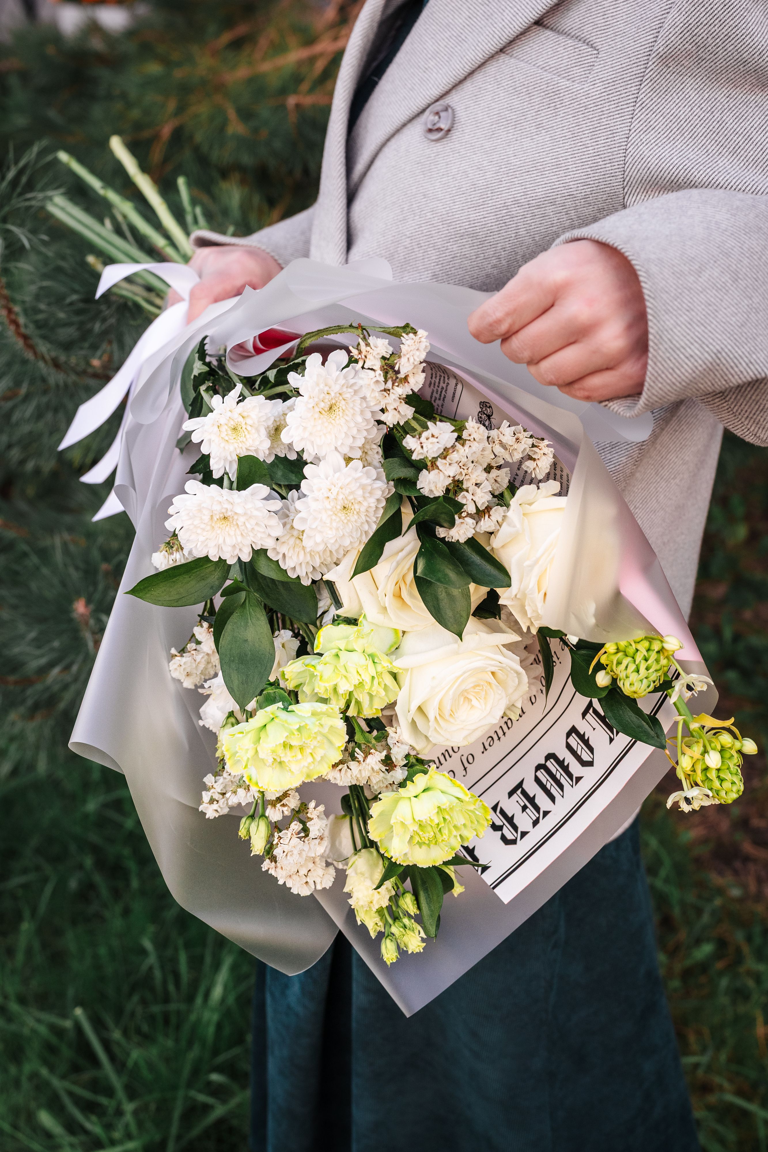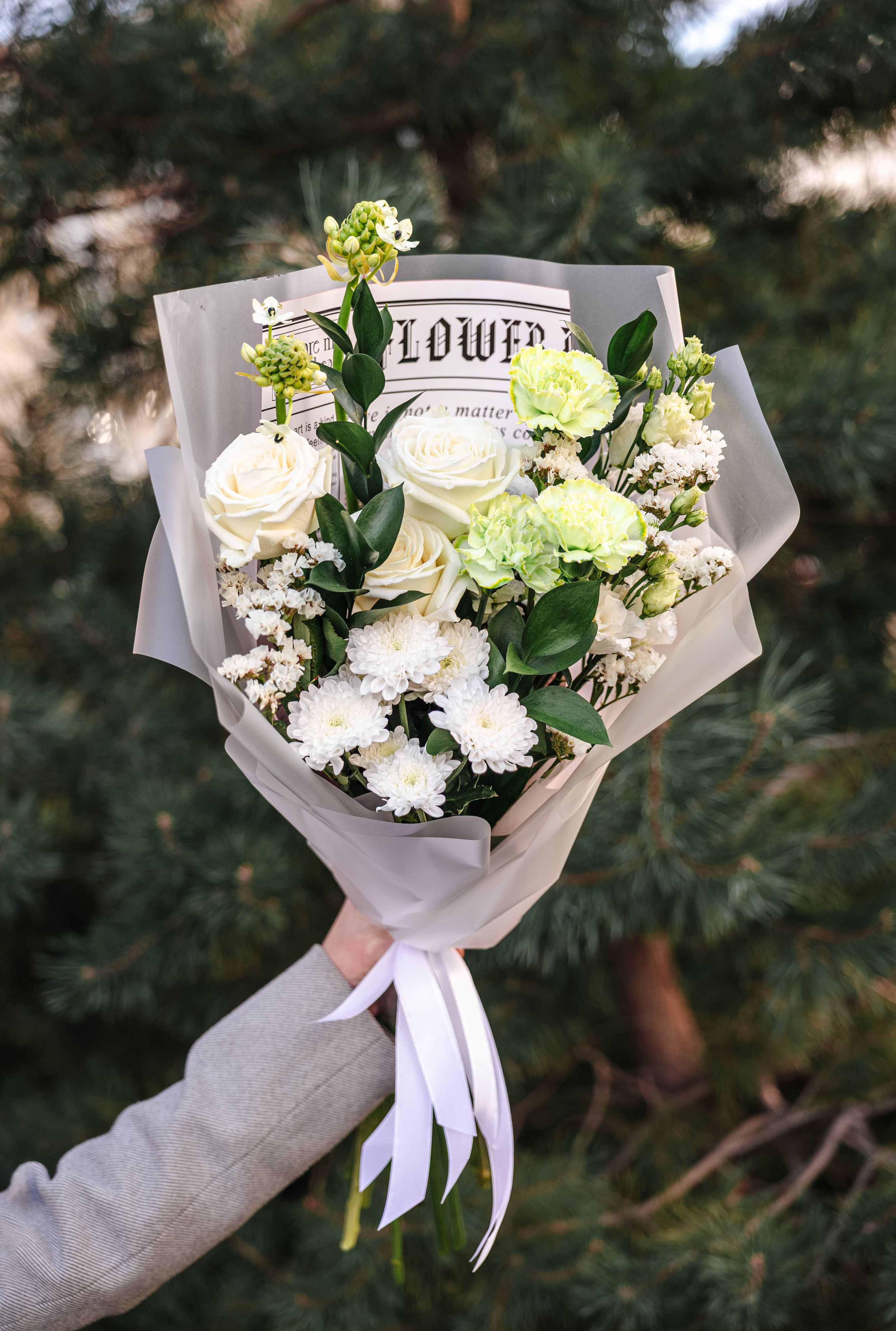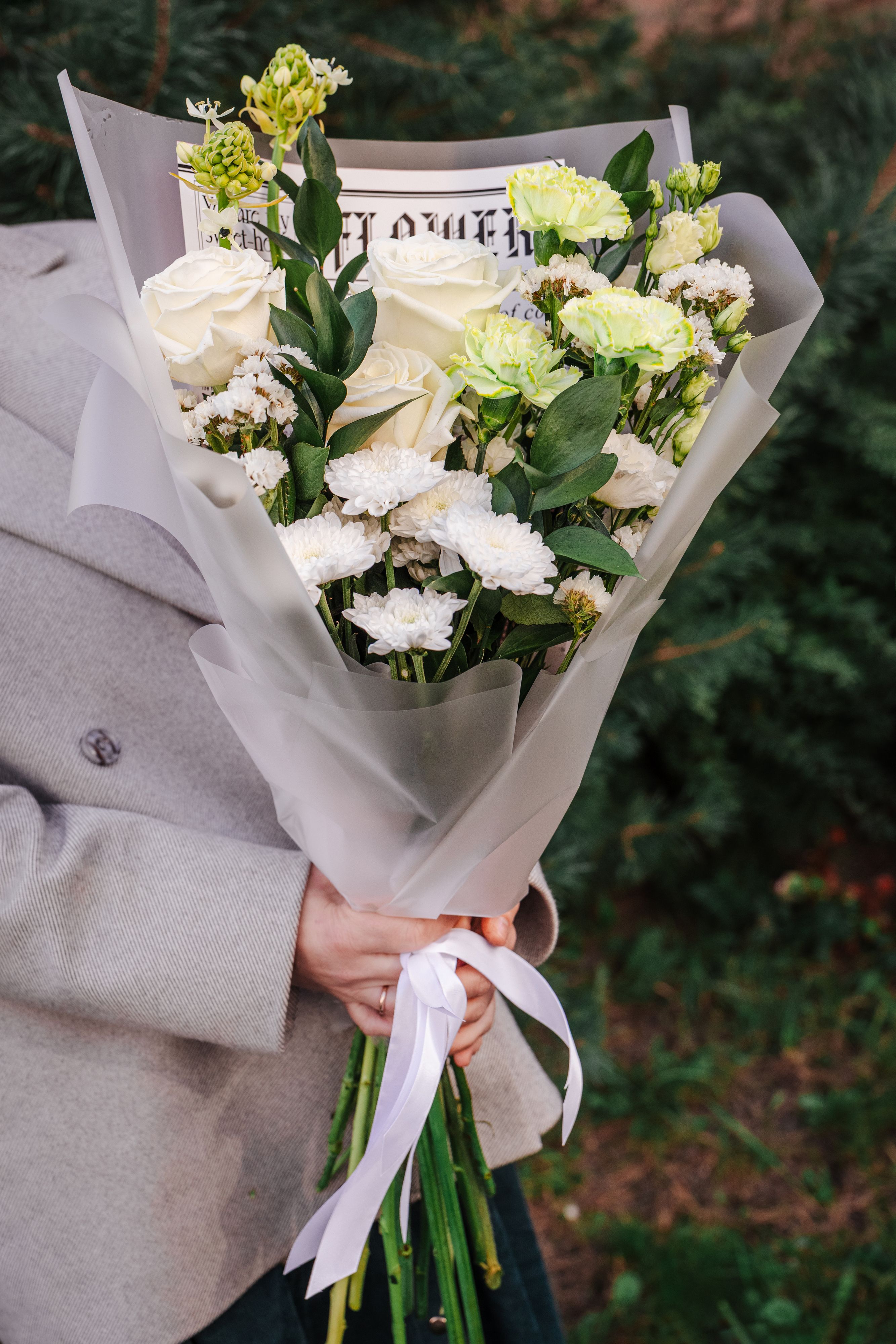Состав букета: гвоздика — 3 шт., белые розы — 3 шт., орнитогалум — 2 шт., лизиантус (эустома) — 2 шт., маттиола — 1 шт., статица — 2 шт., зелень. Каждое растение в композиции имеет своё значение и символику. Белая роза — символ чистоты, искренности и уважения, гвоздика — стойкости и преданности, орнитогалум — изящества и свежести. Лизиантус добавляет нежности и утончённости, маттиола придаёт лёгкий аромат и воздушность, а статица и зелень создают завершённый вид, добавляя структуру и глубину композиции.