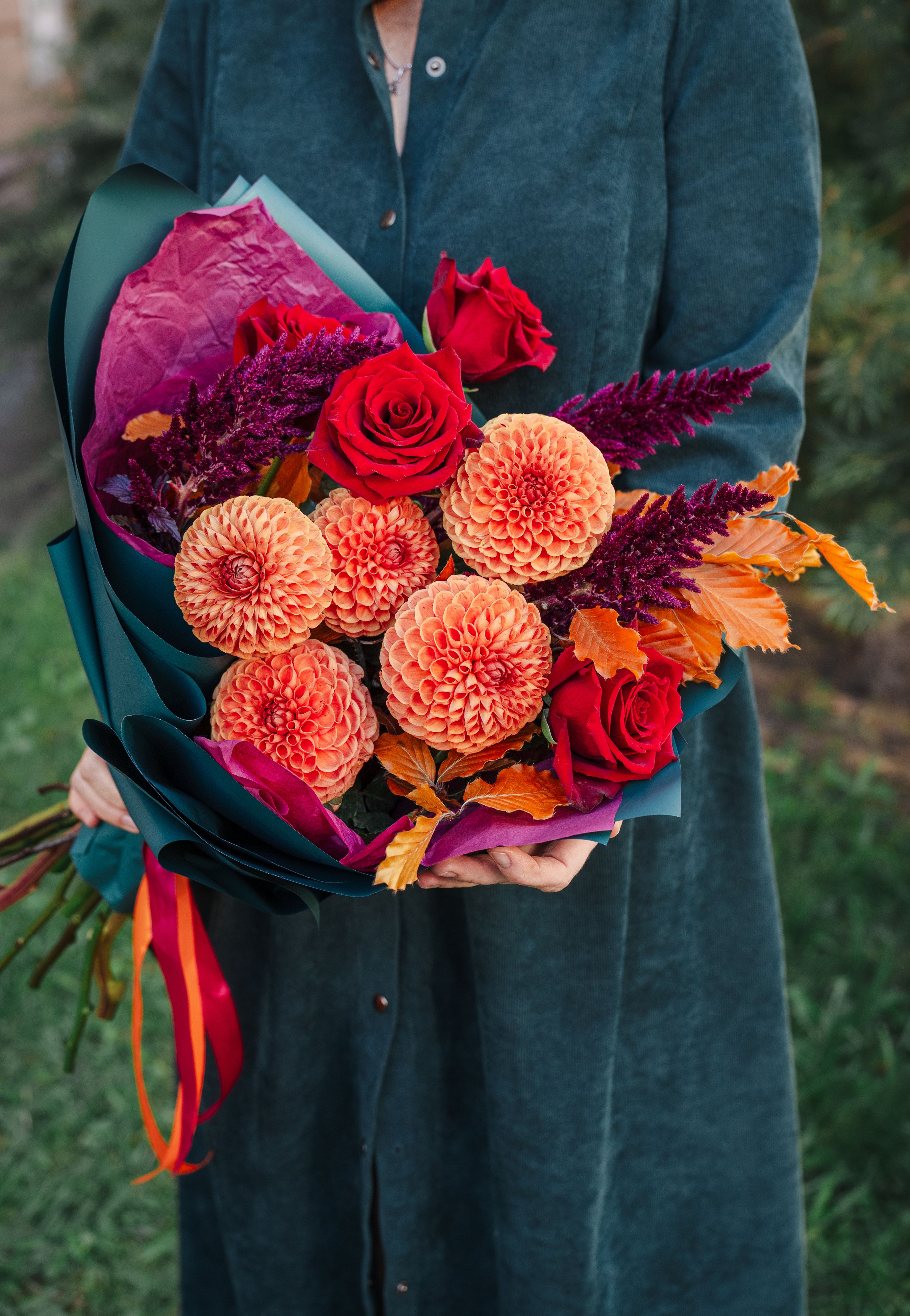 Георгины 5шт, розы 3шт, бук 1 шт, амарант 3шт. Любой букет мы может сделать под ваш запрос. Так же у нас есть доставка. Для уточнения вопросов свяжитесь удобным для вас способом.