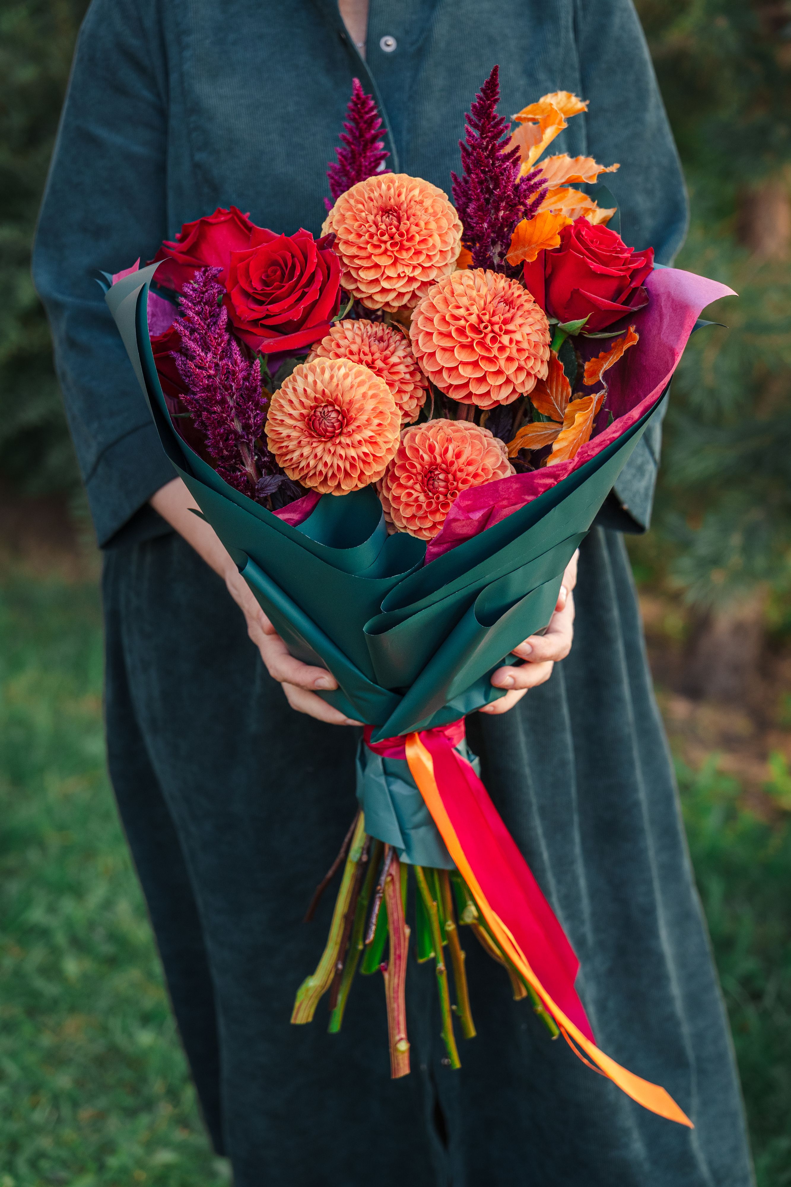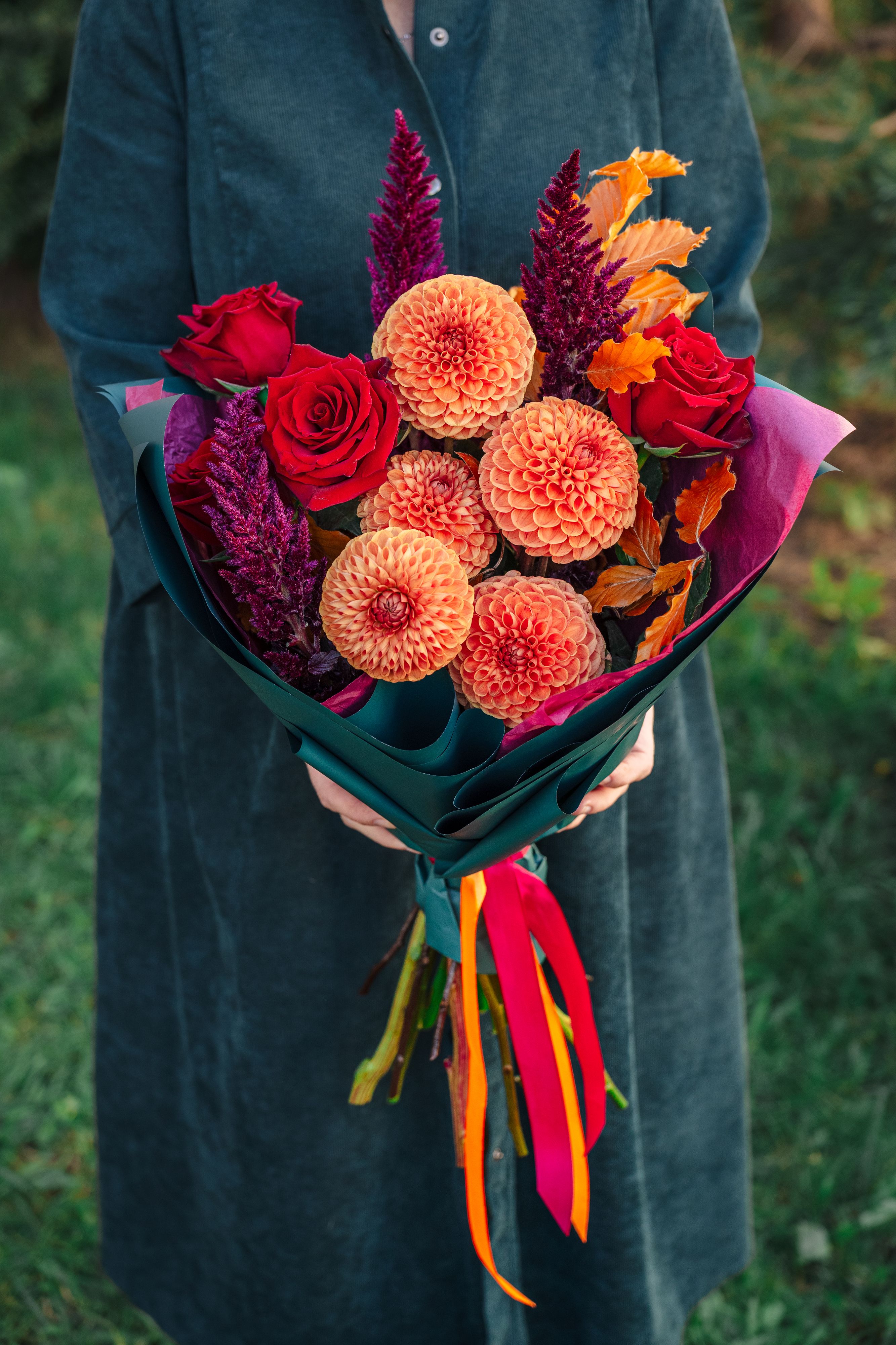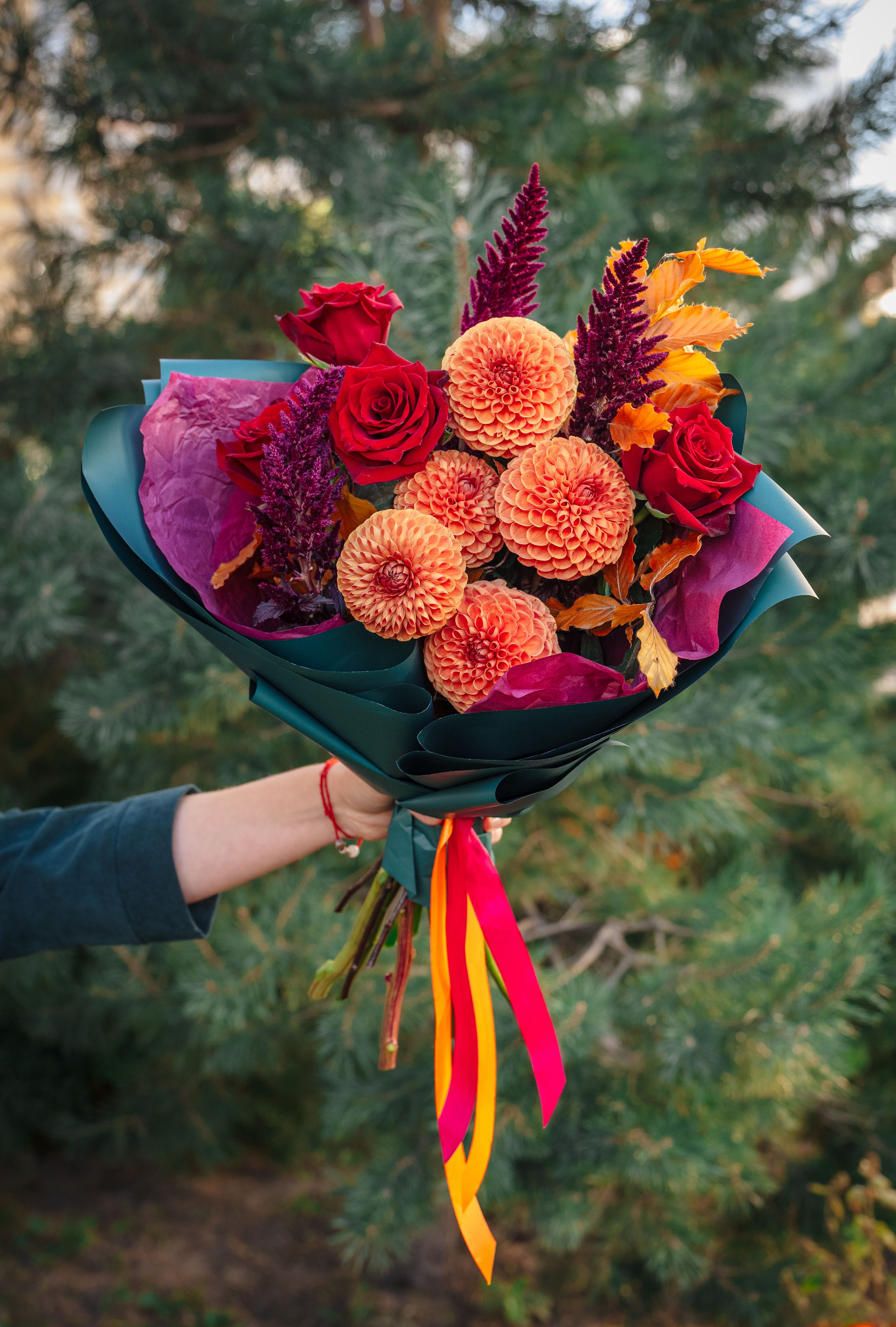 Цветочный магазин «ФламаМама» в Приморском районе Санкт-Петербурга известен своими авторскими букетами, созданными из свежих цветов, поступающих ежедневно от проверенных поставщиков. Мы тщательно следим за качеством каждого цветка, чтобы композиции сохраняли свежесть, форму и привлекательность до 10–12 дней при правильном уходе. Букет с георгинами, розами и амарантом собирается вручную профессиональными флористами, которые подбирают гармоничные сочетания цветов и фактур.