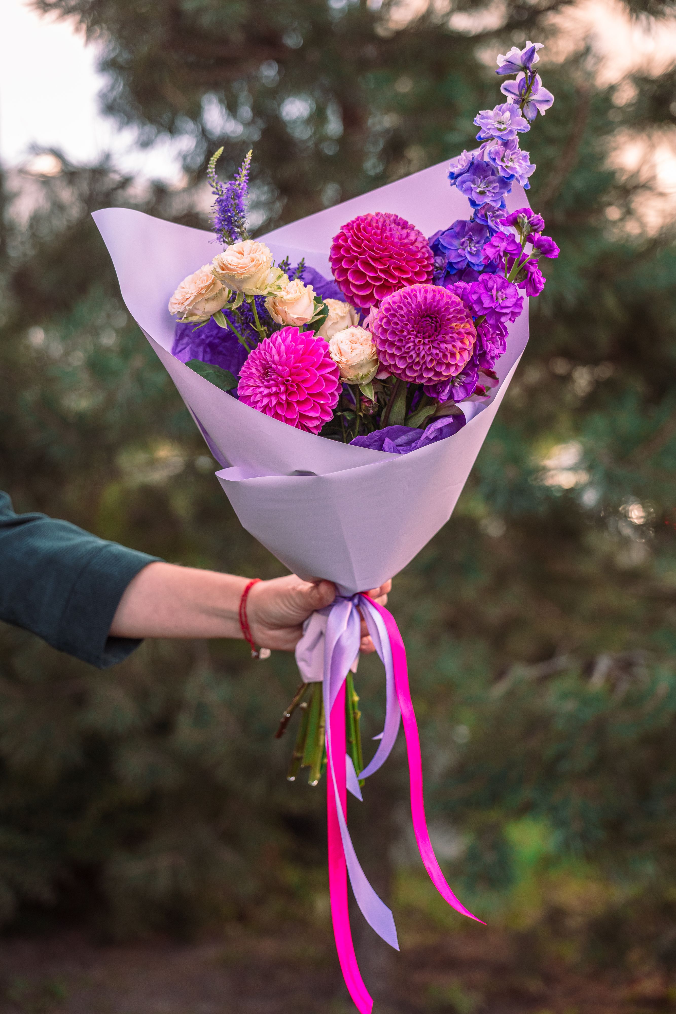 Букет из дельфиниума, кустовых роз, георгинов и шалфея от цветочного магазина «ФламаМама» в Санкт-Петербурге — это стильная и изысканная композиция, сочетающая благородство, свежесть и современный флористический дизайн. Магазин расположен в Приморском районе по адресу Санкт-Петербург, улица Туристская, дом 23, корпус 5. Такой букет станет идеальным подарком для любого повода — дня рождения, юбилея, свадьбы, 8 марта, профессионального праздника или просто как знак внимания близкому человеку.
