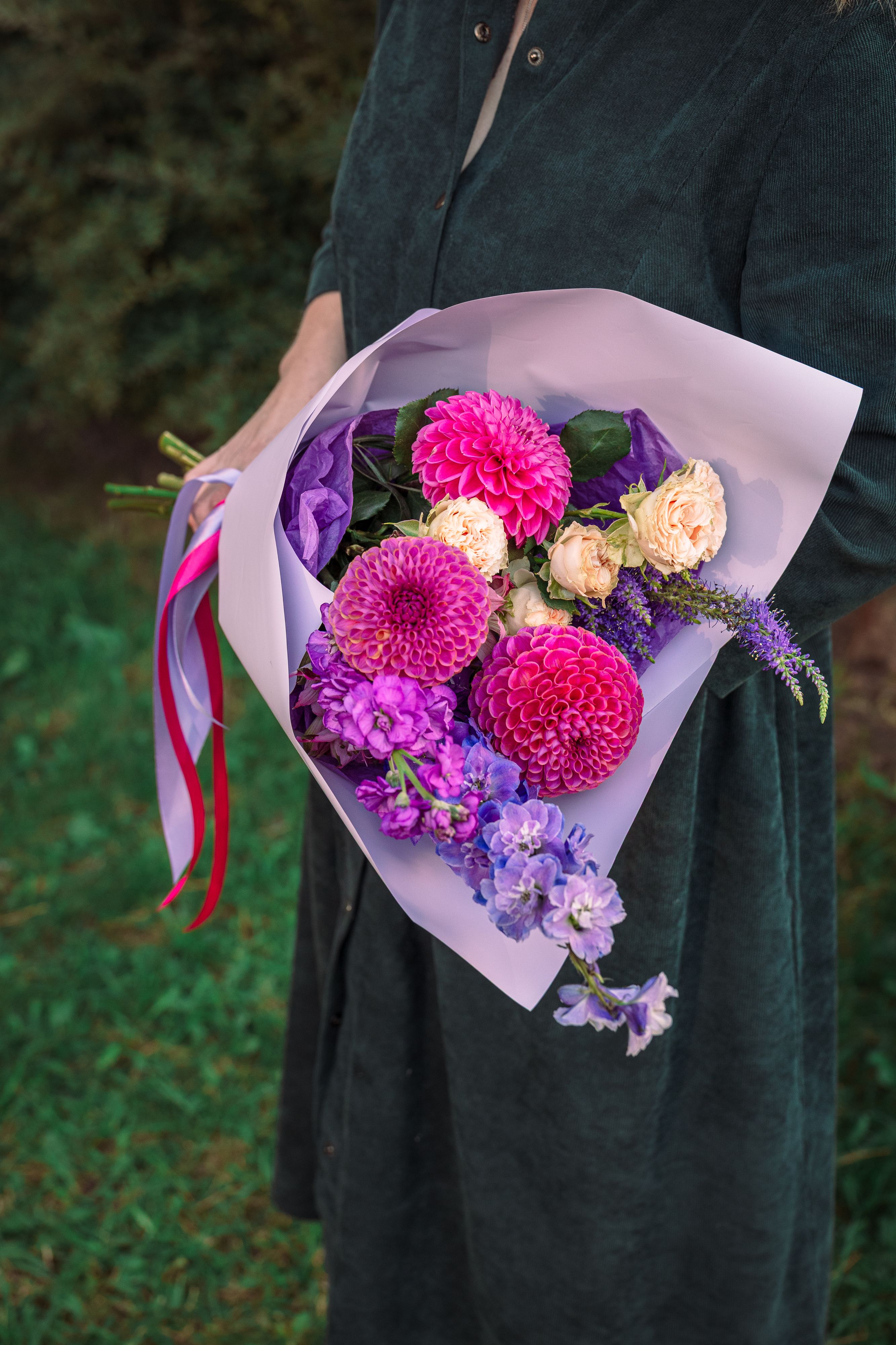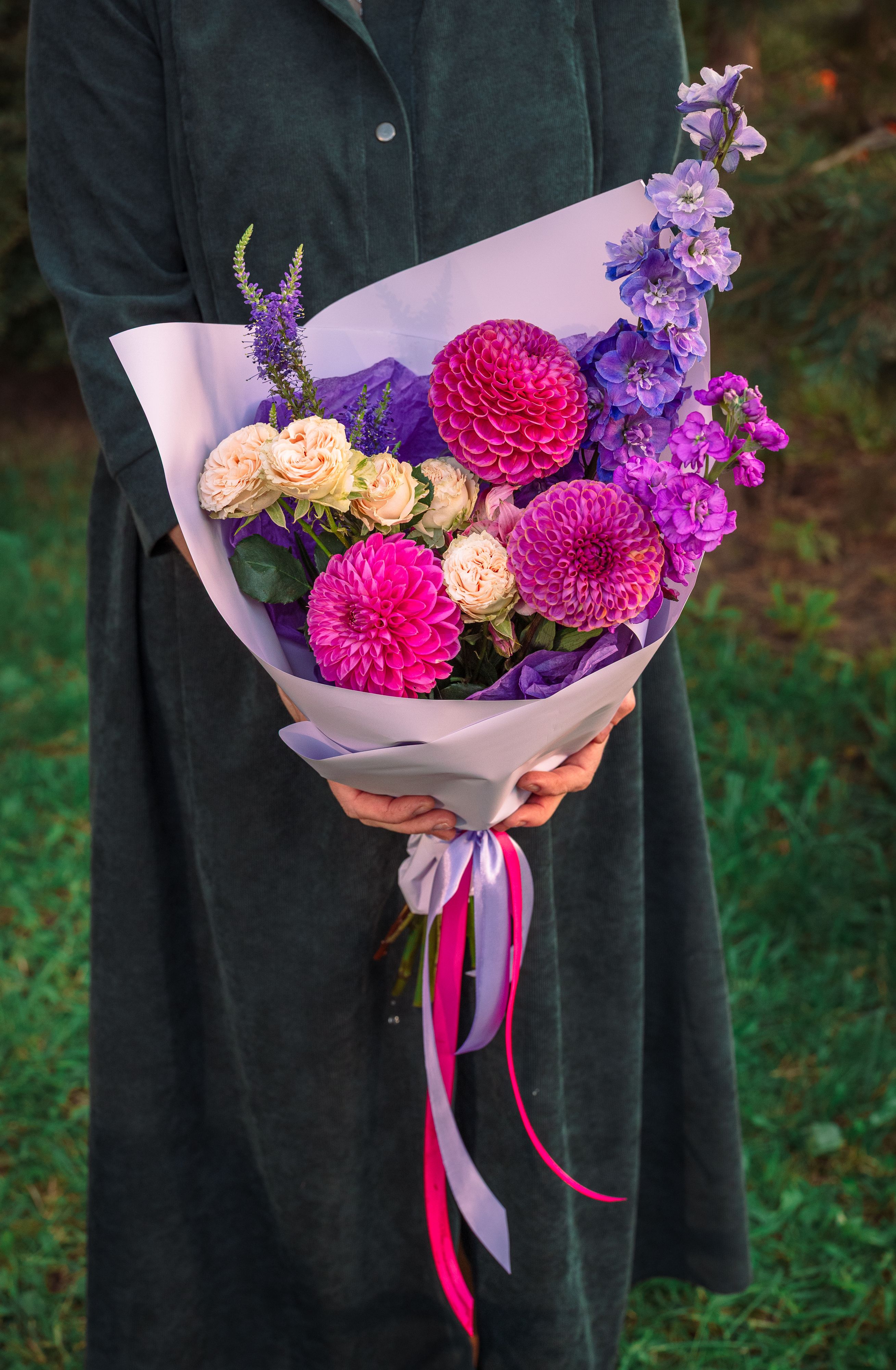Букет с дельфиниумом и георгинами подойдёт как женщинам, так и мужчинам. Он уместен в качестве подарка для коллеги, руководителя, мамы, супруги или подруги. Такая композиция отлично смотрится на фотосессиях, в интерьере или на праздничных мероприятиях, создавая ощущение уюта, стиля и благородства.