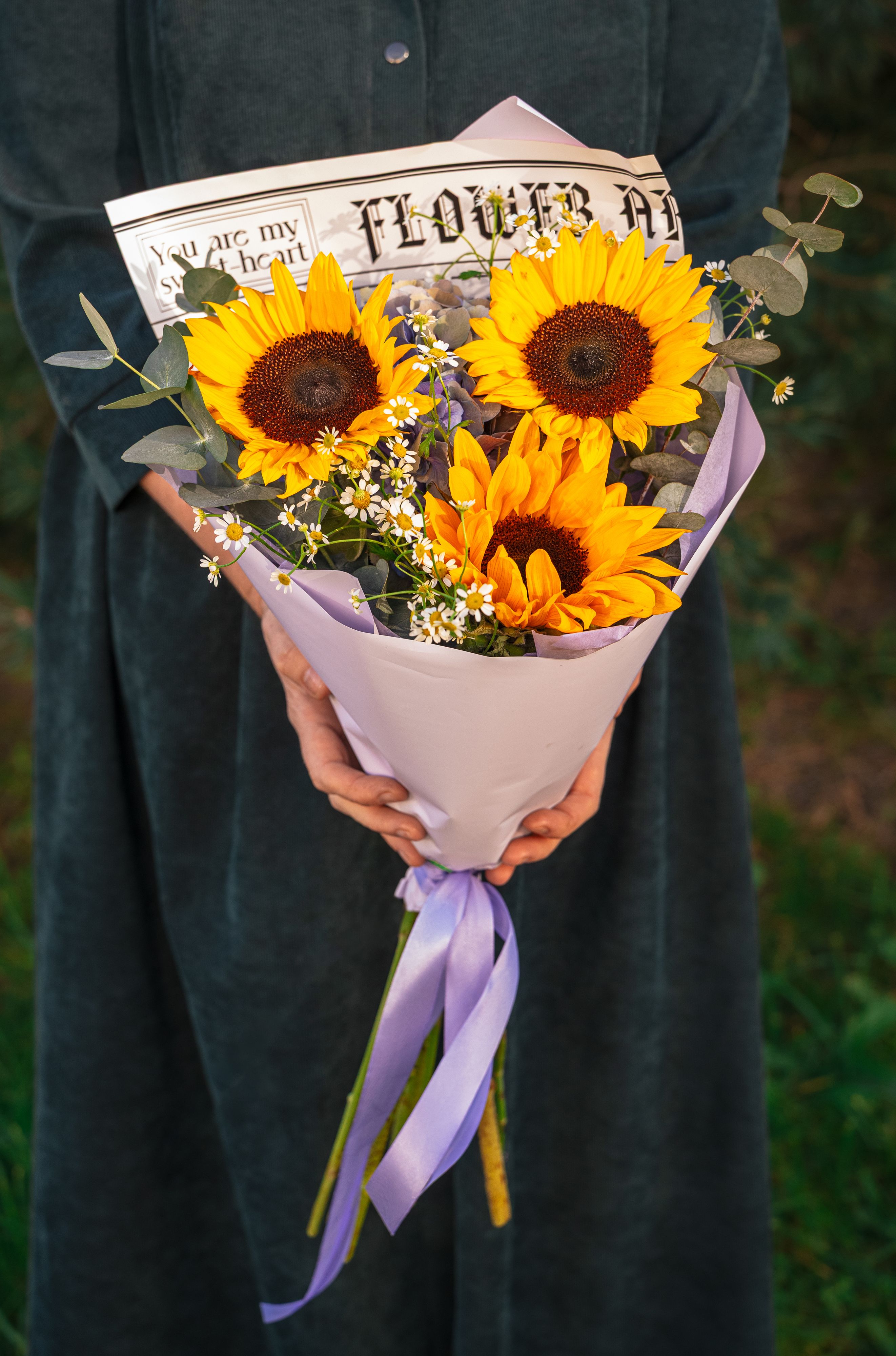 Состав букета: гортензия — 2 шт., матрикария — 2 шт., подсолнух — 3 шт., эвкалипт. Каждое растение в композиции имеет особое значение. Подсолнух символизирует радость, энергию и жизнелюбие, наполняя букет теплом и оптимизмом. Гортензия придаёт композиции объём и утончённость, ассоциируясь с благодарностью, искренностью и гармонией. Матрикария, похожая на миниатюрные ромашки, добавляет лёгкости и воздушности, а эвкалипт завершает образ мягкой зеленью и свежим ароматом. Такое сочетание делает букет универсальным и стильным, подходящим для любого повода.